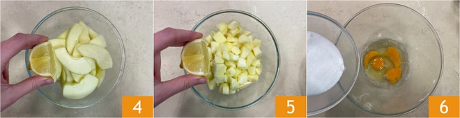 Mettez les pommes dans 2 bols séparés, pressez un demi-citron dans chaque 4 5 et mélangez, ainsi elles ne s'oxyderont pas. Réservez. Maintenant, préparez la pâte : faites fondre le beurre dans une casserole et laissez tiédir. Entre-temps, dans un bol, mettez les œufs et le sucre 6.