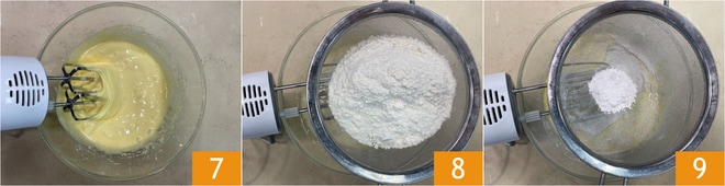 Travaillez avec des fouets électriques pendant 5-7 minutes 7 jusqu'à obtenir un mélange clair, mousseux et triplé de volume. Tamisez dans le bol la farine 8 et la levure chimique 9.