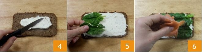 Composez la tarte: prenez une tranche de pain rectangulaire (si d'une autre forme, découpez-la comme vous le souhaitez), placez-la sur la planche à découper et tartinez-la de crème 4, puis ajoutez des feuilles d'épinards (lavées et séchées) et quelques tranches de saumon (5-6).
