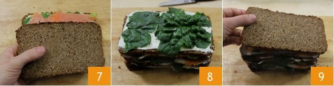 Recouvrez avec une tranche de pain 7 et recommencez avec la crème de fromage, les épinards et le saumon, jusqu'à épuisement de tous les ingrédients 9. Terminez par une tranche de pain 9 et mettez la tarte au saumon au réfrigérateur pour raffermir.
