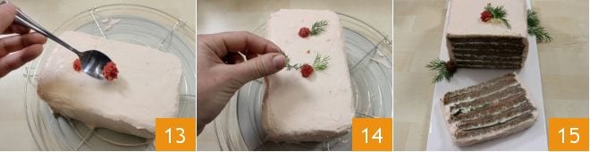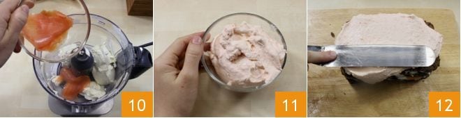 Préparez maintenant la crème pour la couverture: prenez 300 g de fromage et mixez-les avec le saumon 10 et une cuillère à soupe de lait, jusqu'à obtenir une crème très lisse 11, que vous mettrez au réfrigérateur pendant au moins 30 minutes pour qu'elle puisse s'étaler plus facilement. Après ce temps, étalez la crème sur la surface du pain et sur les côtés, afin de recouvrir toute la tarte 12 avec une spatule spéciale ou un couteau à lame lisse. Une fois complètement recouverte, mettez-la au réfrigérateur pendant au moins une heure pour la raffermir.
