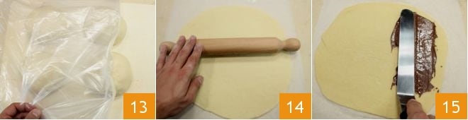 Laissez reposer les 4 boules couvertes avec du film plastique 13 pendant au moins 20 minutes à température ambiante. Ensuite, farinez légèrement un plan de travail, écrasez légèrement chaque boule et étalez-la avec un rouleau à pâtisserie sur une feuille de papier sulfurisé, jusqu'à obtenir un disque de 26 cm de diamètre 14; mettez le disque à raffermir au réfrigérateur pendant au moins 20 minutes et continuez avec les autres, en répétant les mêmes opérations. Puis sortez du frigo le premier disque que vous aviez étalé et tartinez la surface avec le Nutella 15;