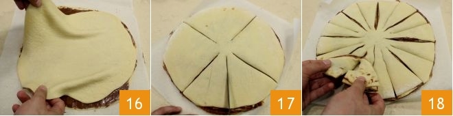 prenez ensuite un autre disque, à poser sur la couche de Nutella 16; continuez ainsi jusqu'à épuisement des ingrédients: comme dernière couche, vous devez avoir celle de pain brioché. Laissez reposer le tout pendant au moins 30 minutes au réfrigérateur couvert de film plastique (pour vous aider dans le transfert, vous pouvez poser la pâte sur un plateau et la mettre au réfrigérateur). Pratiquez des incisions sur la surface en laissant un bord du centre; commencez par 4 incisions en croix, puis faites-en une autre entre chaque coupe 17. Continuez jusqu'à en réaliser 16; puis prenez chaque quartier entre vos doigts et effectuez une torsion en tournant chacun sur lui-même mais dans des directions opposées, en faisant un tour complet 18