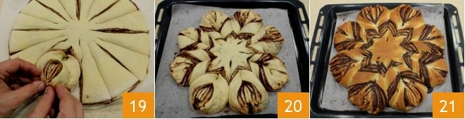 et en joignant les côtés les plus courts qui seront orientés vers le haut 19. Complétez le gâteau en exécutant la même opération pour toutes les paires de quartiers, puis posez-le avec le papier sulfurisé sur une plaque de cuisson et laissez lever pendant au moins 1 heure couvert de film plastique. Après ce temps 20, faites cuire au four statique préchauffé à 180°C pendant environ 40 minutes (à 160°C pendant environ 30 minutes si four ventilé). Une fois cuit, sortez le gâteau fleur 21 et laissez-le tiédir sur une grille, puis servez-le!