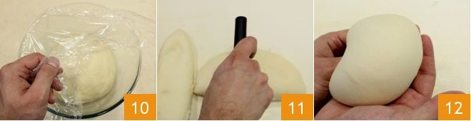 Formez ensuite une boule avec la pâte, transférez-la dans un bol légèrement beurré et couvrez avec du film plastique 10. Laissez-la lever pendant 3 heures dans le four éteint avec la lumière allumée (ou jusqu'à ce qu'elle ait doublé de volume); après ce temps, reprenez la pâte et divisez-la en 4 parts de même poids 11. Manipulez chaque pièce pour lui donner une forme ronde 12.