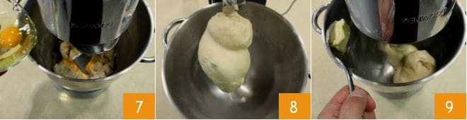 ensuite, versez les œufs un à un 7, en attendant qu'ils s'incorporent avant d'en ajouter un autre. Pétrissez jusqu'à obtenir une consistance lisse et homogène et jusqu'à ce que la pâte se détache des bords en s'accrochant au crochet 8. À ce stade, vous pouvez ajouter le beurre ramolli un morceau à la fois, en attendant qu'il soit absorbé avant de procéder avec un autre morceau 9. Lorsque tout le beurre sera absorbé et que la pâte sera devenue brillante et bien accrochée, arrêtez le robot, transférez la pâte sur un plan de travail, huilez vos mains avec le beurre, et continuez à pétrir quelques minutes.