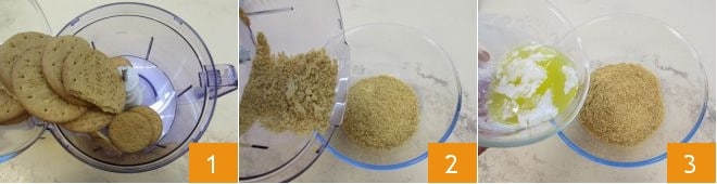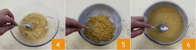 tout en remuant les ingrédients avec une cuillère pour les amalgamer et obtenir un mélange sablonneux 4. Ensuite, prenez un moule à charnière de 24 cm de diamètre, beurrez-le et chemisez-le avec du papier sulfurisé. Versez-y le mélange de biscuits et de beurre 5 et nivelez-le pour revêtir uniformément toute la base, en vous aidant avec le dos d'une cuillère 6. Réfrigérez pour compacter pendant au moins 30 minutes.
