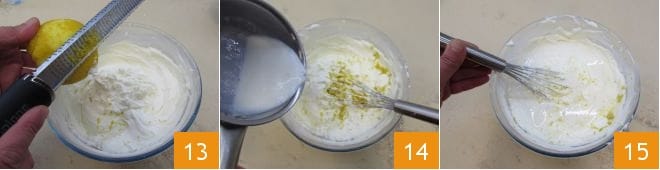 Râpez le zeste d'un citron non traité 13 et ajoutez le mélange de lait et gélatine désormais tiède 14. Mélangez pour uniformiser les ingrédients 15.