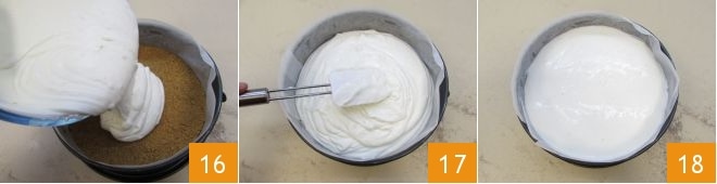 Ensuite, sortez le moule du réfrigérateur et versez-y la crème de yaourt et mascarpone 16. Lissez-la en vous aidant d'une spatule 17 et réfrigérez pour durcir pendant au moins 4 heures 18.