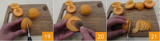 Maintenant, consacrez-vous à la décoration. Rincez les abricots, essuyez-les et coupez-les en deux 19. Ôtez-en le noyau 20 et découpez de chaque moitié des tranches fines 21.