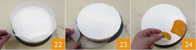 Après les 2 heures, sortez le gâteau du réfrigérateur en vérifiant que la crème s'est solidifiée et démoulez-le. Retirez délicatement l'anneau du moule à charnière, et retirez le papier sulfurisé des bords du gâteau 22. Pour enlever celui du fond, aidez-vous de deux spatules plates et longues à insérer entre le fond et le papier lui-même et transférez le gâteau sur un plat de service. Nivelez éventuellement les bords latéraux du gâteau 23. Ensuite, commencez à disposer les tranches d'abricots 24.