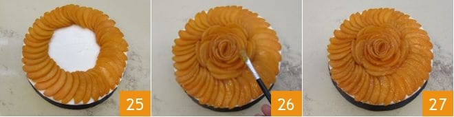 Disposez-les en créant un motif en rayons partant des bords du gâteau 25 jusqu'à couvrir également sa partie intérieure. Vous pouvez disposer les abricots en dessinant un motif de rose au centre. Enfin, prenez la confiture d'abricots et en vous aidant d'un pinceau, badigeonnez uniformément la surface du gâteau 26 en couvrant les éventuels espaces entre les fruits. Maintenant, le dessert est prêt et il ne vous reste plus qu'à déguster votre gâteau froid aux abricots 27 !