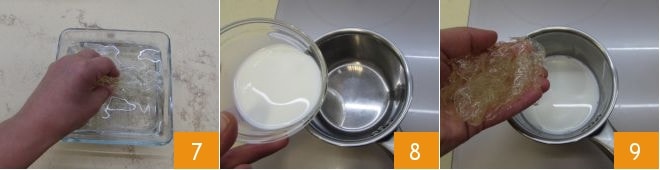 Entre-temps, préparez la crème. Faites tremper les feuilles de gélatine dans un bol d'eau froide 7. Laissez-les ramollir pendant au moins 10 minutes. Ensuite, prenez une casserole dans laquelle vous verserez le lait 8. Portez-le à frémir et éteignez le feu. Ensuite, prenez la gélatine trempée, égouttez-la et pressez-la bien et ajoutez-la au lait 9.