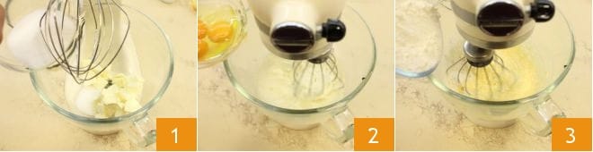 Pour réaliser le gâteau renversé aux pêches et amaretti, placez dans le bol d'un robot équipé d'un fouet le beurre en morceaux ramolli et le sucre en poudre 1, actionnez les fouets pour mélanger les ingrédients et obtenir une crème, puis ajoutez les œufs 2, les graines de la gousse de vanille, la farine et la levure tamisées 3.