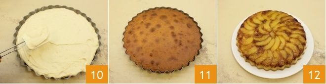 À ce stade, versez sur les pêches la pâte du gâteau, nivelez-la avec une spatule 10 et faites cuire au four statique à 180° pendant 45 minutes (ou au four ventilé à 160° pendant 35 minutes). À la fin de la cuisson, sortez le moule du four 11, laissez-le refroidir puis renversez-le sur un plat de service. Votre gâteau renversé aux pêches et amaretti est prêt à être dégusté 12 !