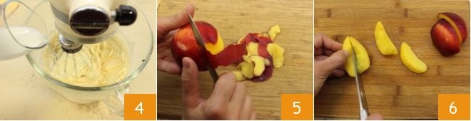 Versez le lait en filet 4 pendant que la machine est en marche. Lavez, épluchez les pêches 5 et coupez-les en quartiers 6.