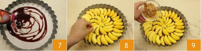 Répartissez le caramel au fond d'un moule de 28 cm de diamètre avec le bord ondulé 7, beurrez et farinez légèrement le bord ondulé avant de disposer les tranches de pêche en étoile dans le moule 8 puis saupoudrez la surface avec les amaretti émiettés 9.