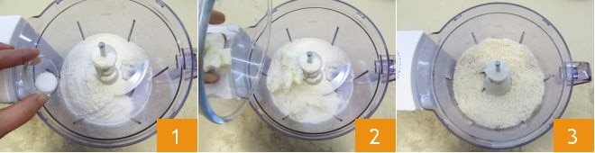 Pour préparer la tarte salée caprese, commencez par réaliser la pâte brisée. Placez dans le mixeur la farine, le sel 1 le beurre froid coupé en dés 2 et commencez à mixer jusqu'à obtenir une texture sableuse et farineuse 3.