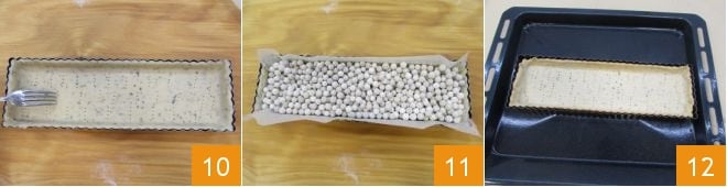 Piquez le fond de la tarte salée avec les dents d'une fourchette 10, revêtez-la d'un rectangle de papier sulfurisé, légèrement plus grand que le moule, et continuez avec la Comment faire la cuisson à blanc. Versez les billes de céramique (ou les pois chiches secs) sur le papier sulfurisé 11 et enfournez dans un four statique préchauffé à 180° pendant 30 minutes (si vous utilisez un four ventilé, cuisez à 160° pendant environ 25 minutes). Une fois sortie du four, retirez les billes 12 et laissez refroidir.