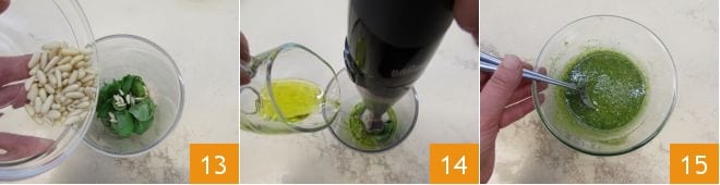 Pendant ce temps, préparez la crème de basilic. Lavez et séchez délicatement les feuilles de basilic, puis mettez-les dans le bol d'un mixeur avec les pignons 13, ajoutez également l'huile en filet et commencez à mixer 14 jusqu'à obtenir une crème lisse. Transférez-la ensuite dans un bol 15 et salez-la.