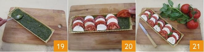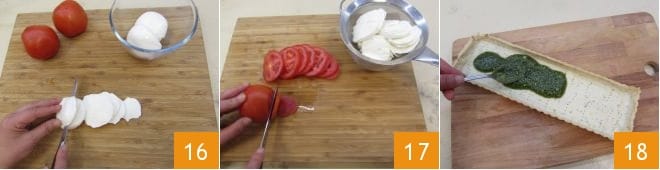 Coupez la mozzarella en tranches 16 et laissez-la égoutter dans une passoire, juste le temps de terminer les autres préparations. Coupez également la tomate en tranches 17 et réservez-la. Reprenez votre base de pâte brisée, maintenant froide, et commencez à verser la crème de basilic 18.