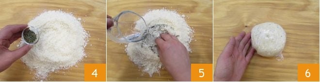 Transférez-la ensuite sur un plan de travail, formez une fontaine et ajoutez l'origan sec au centre 4. Versez l'eau froide et commencez à pétrir rapidement 5, afin de ne pas chauffer la pâte. Travaillez jusqu'à ce que le mélange soit homogène, puis enveloppez-le dans du film alimentaire 6 et laissez reposer pendant 40 minutes au réfrigérateur.