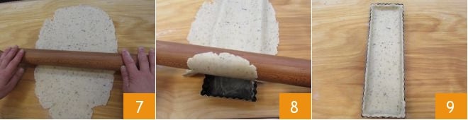Après le temps de repos, sortez la pâte du réfrigérateur et étalez-la sur un plan légèrement fariné, jusqu'à obtenir une épaisseur d'environ un demi-cm 7. Enroulez ensuite la pâte autour du rouleau à pâtisserie et transférez-la dans un moule rectangulaire de 35X11 8, pressez légèrement avec les doigts pour bien faire adhérer la pâte au moule et découpez les éventuels excès de pâte 9.