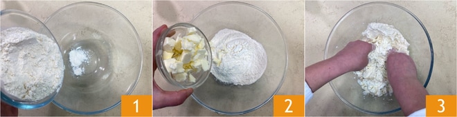 Pour réaliser la tarte salée aux poireaux et brie, commencez par préparer la base : dans un bol, versez la farine et le sel 1, puis ajoutez le beurre froid en cubes 2 et travaillez rapidement du bout des doigts pour obtenir un mélange sableux 3.