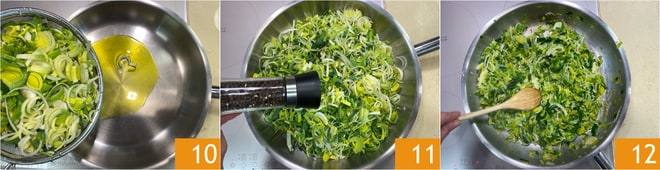 Chauffez un filet d'huile dans une poêle, puis ajoutez les poireaux 10, salez et poivrez 11. Faites cuire à feu moyen pendant environ 15 minutes, jusqu'à ce qu'ils soient ramollis 12. Éteignez le feu et laissez tiédir.