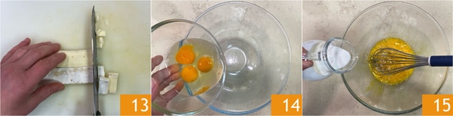 Pendant ce temps, préparez la garniture : coupez le brie en cubes, sans enlever la croûte 13. Cassez les œufs dans un bol 14 et battez-les avec un fouet à main, puis ajoutez la crème 15.