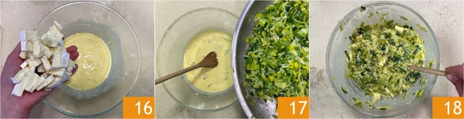 Ajoutez le fromage en cubes au mélange 16, salez, poivrez et mélangez avec une cuillère. Enfin, ajoutez les poireaux tiédis 17 et mélangez le tout 18.