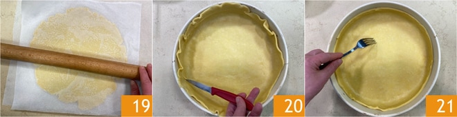 À ce stade, reprenez la pâte du frigo, placez-la entre 2 feuilles de papier sulfurisé et étalez-la avec un rouleau à pâtisserie jusqu'à une épaisseur d'environ 5 mm 19. Transférez la pâte avec le papier sulfurisé dans un moule de 28 cm de diamètre, puis égalisez le bord avec un petit couteau 20 et piquez le fond avec une fourchette 21.