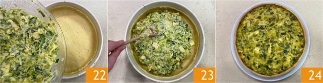 Versez la garniture dans le moule 22 et égalisez la surface 23, puis faites cuire dans un four statique à 180° pendant environ 55 minutes. Sortez du four et laissez légèrement tiédir avant de servir votre tarte salée aux poireaux et brie 24 !
