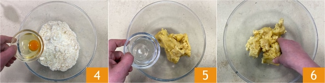 Ajoutez l'œuf 4 et continuez à pétrir, puis versez également l'eau froide 5 et travaillez jusqu'à ce qu'elle soit complètement absorbée 6.