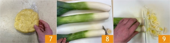 Lorsque vous obtenez une pâte lisse et homogène, enveloppez-la dans du film alimentaire 7 et laissez reposer au réfrigérateur pendant 30 minutes. Pendant ce temps, nettoyez les poireaux : éliminez les extrémités 8 et la partie verte, puis divisez-les en deux dans le sens de la longueur et coupez-les finement 9.
