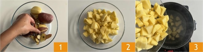 Pour préparer la tarte salée pommes de terre et lardons, commencez par les pommes de terre : lavez-les, épluchez-les 1 et coupez-les en dés 2. Portez à ébullition une casserole avec beaucoup d'eau salée et faites cuire les pommes de terre pendant 2 à 3 minutes 3.