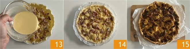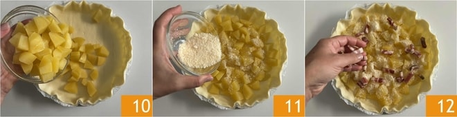 Répartissez sur la base les pommes de terre tièdes 10, le fromage râpé 11 et les lardons 12.