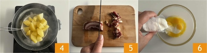 Égouttez les pommes de terre 4 et laissez refroidir. Pendant ce temps, coupez les lardons en dés 5. Dans un bol, versez les œufs et la crème 6.