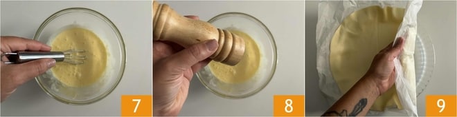 Battez le mélange avec un fouet 7, puis assaisonnez de sel et de poivre 8 et mélangez encore. À ce stade, déroulez la pâte brisée et placez-la avec son papier sulfurisé dans un moule de 28 cm de diamètre 9.