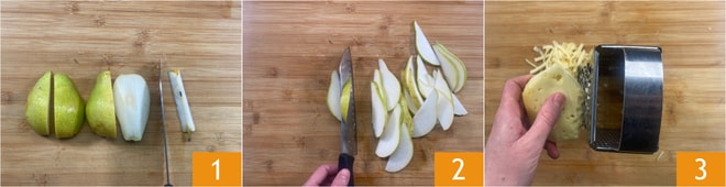 Pour préparer la tarte salée poires et gorgonzola, commencez par couper les poires en quartiers 1, enlevez le trognon et découpez-les en fines tranches 2 d'environ 2-3 mm d'épaisseur. Râpez la fontine 3, hachez grossièrement les noisettes et réservez.