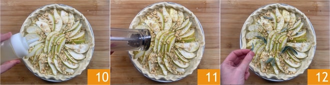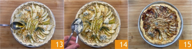 Complétez avec du miel de châtaignier 13 et encore un peu de gorgonzola 14. Faites cuire au four statique, sur la grille du milieu, à 200°C pendant 30 minutes, jusqu'à ce qu'elle soit dorée. Laissez tiédir et votre tarte salée poires et gorgonzola est prête à être dégustée 15.