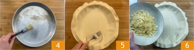 Graissez un moule rond de 26 cm de diamètre 4. Tapisser le moule de pâte feuilletée et piquez le fond avec les dents d'une fourchette 5. Couvrez le fond avec la fontine 6.