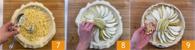 Ajoutez 5-6 cuillerées de gorgonzola 7, puis disposez les tranches de poire en rosace et fermez également le centre 8. Roulez le bord en cordon. Sur la surface, répartissez les noisettes hachées 9.
