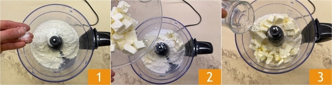 Pour préparer la tarte salée au jambon et fromage, commencez par la pâte brisée : dans un mixeur, versez la farine et une pincée de sel 1. Ajoutez le beurre froid coupé en morceaux 2, puis versez l'eau froide 3.