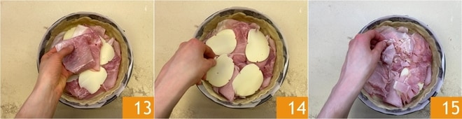 Ajoutez une seconde couche de jambon 13 et de fromage 14, puis complétez avec une dernière couche uniquement de jambon 15.