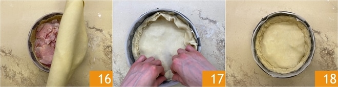 Recouvrez maintenant la tarte avec la seconde pâte brisée 16. Joignez les bords des deux pâtes et repliez-les vers l'intérieur 17 pour créer une sorte de corde autour du bord 18.