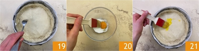 Piquez aussi la surface avec une fourchette 19. Dans un bol, mélangez le lait et le jaune d'œuf 20 et badigeonnez la tarte avec cette émulsion 21.
