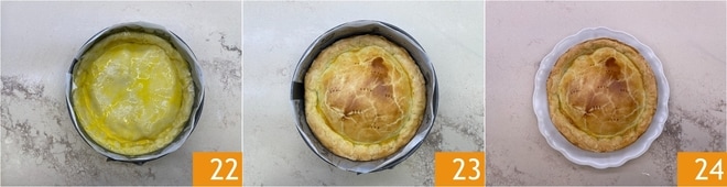 Cuisez dans un four statique préchauffé à 170° pendant une heure 22. Une fois ce temps écoulé, sortez du four 23 et laissez tiédir votre tarte salée jambon et fromage avant de la servir 24 !