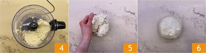 Faites fonctionner le mixeur pour pétrir rapidement les ingrédients 4, puis transférez le mélange sur le plan de travail et pétrissez à la main 5 pour créer une pâte homogène. Enveloppez la pâte dans un film plastique 6 et laissez reposer une heure au réfrigérateur.