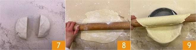 Reprenez la pâte du frigo et divisez-la en deux 7. Tapissez un moule à charnière de 22 cm de diamètre avec du papier sulfurisé. Étalez les deux portions de pâte avec un rouleau à pâtisserie jusqu'à un diamètre de 25-26 cm 8. Enroulez la pâte brisée sur le rouleau et déroulez-la au-dessus du moule 9.